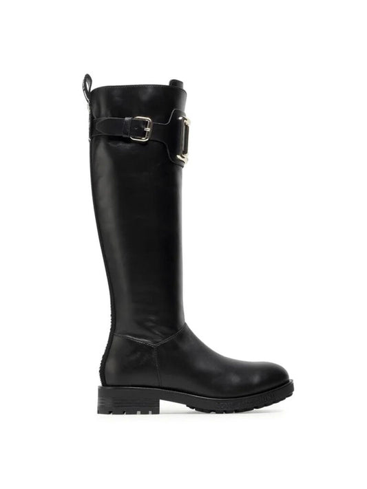 Black Leather Knee-High Boots with Gold Buckle Detail