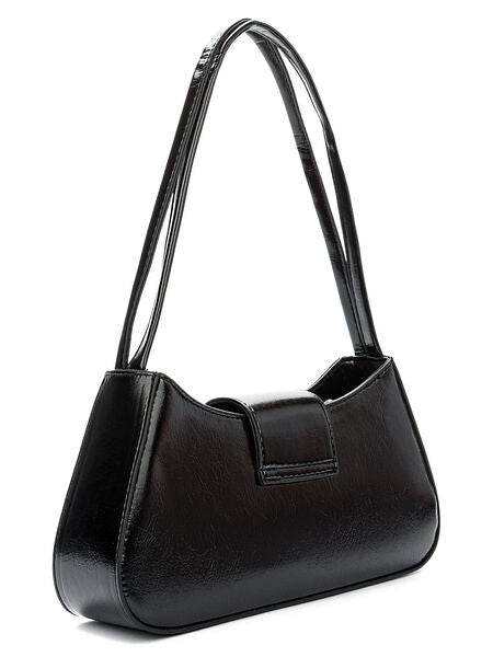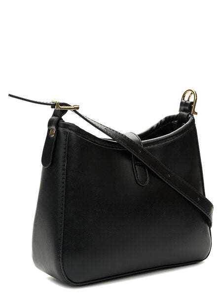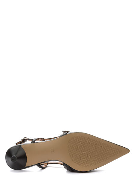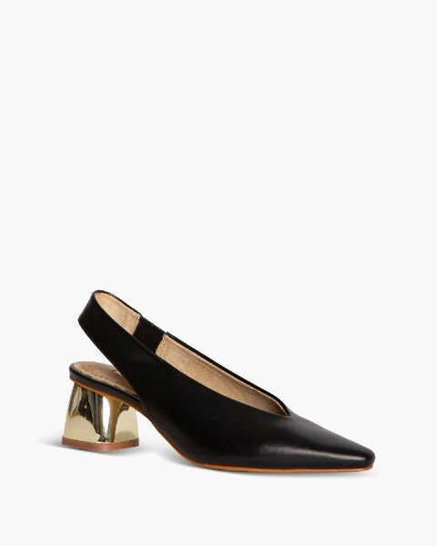 Black Leather Sandal with Gold Buckle and Artistic Heel