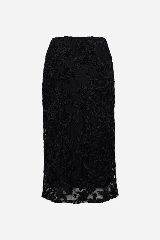 Black Lace Overlay Midi Skirt with Ruched Waist