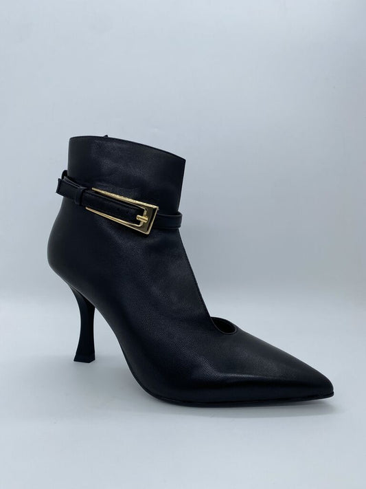 Black Leather Knee-High Boots with Gold Buckle Detail