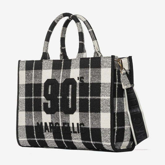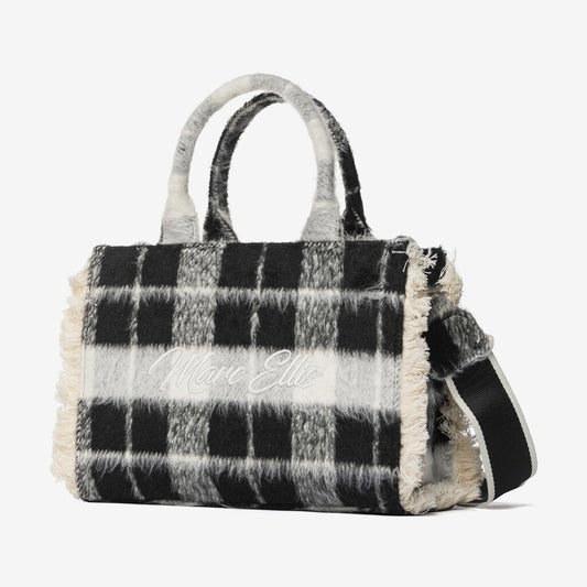 Black Plaid Handbag with Frayed Edges and Logo Detail