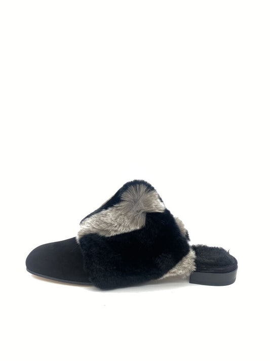 Black Fur Slip-On Mules with Plush Trim