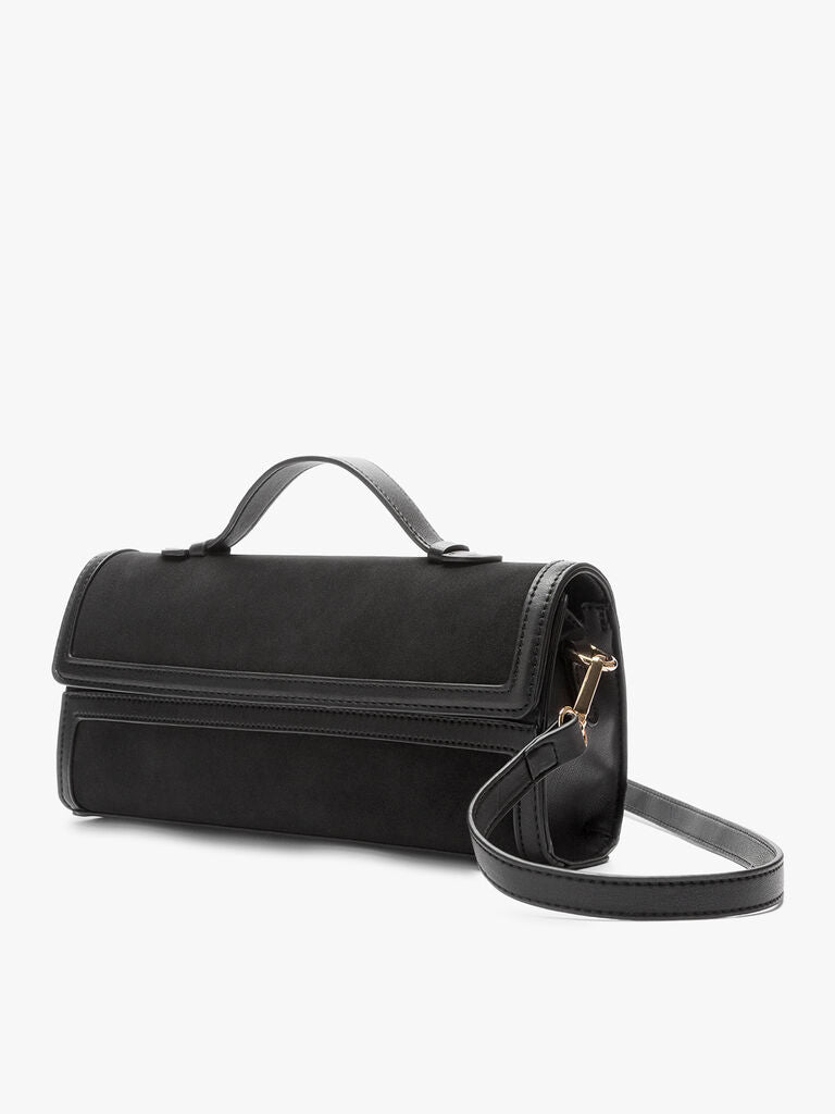 Elevate any occasion with this sleek black suede clutch, offering a perfect blend of elegance and utility. Its structured form and top handle add sophistication to your ensemble, making it an ideal accessory for both formal and casual outings.