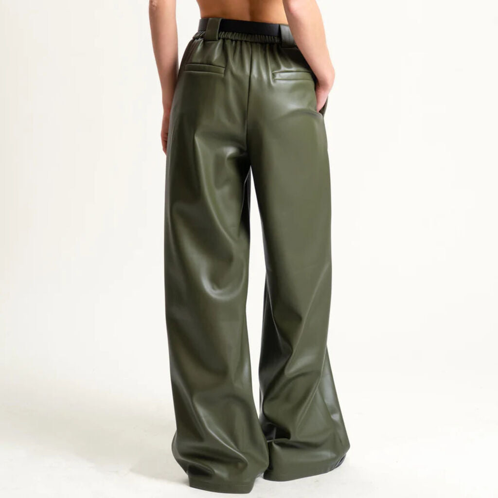 Embrace the bold sophistication of faux leather with these wide-leg trousers in olive.