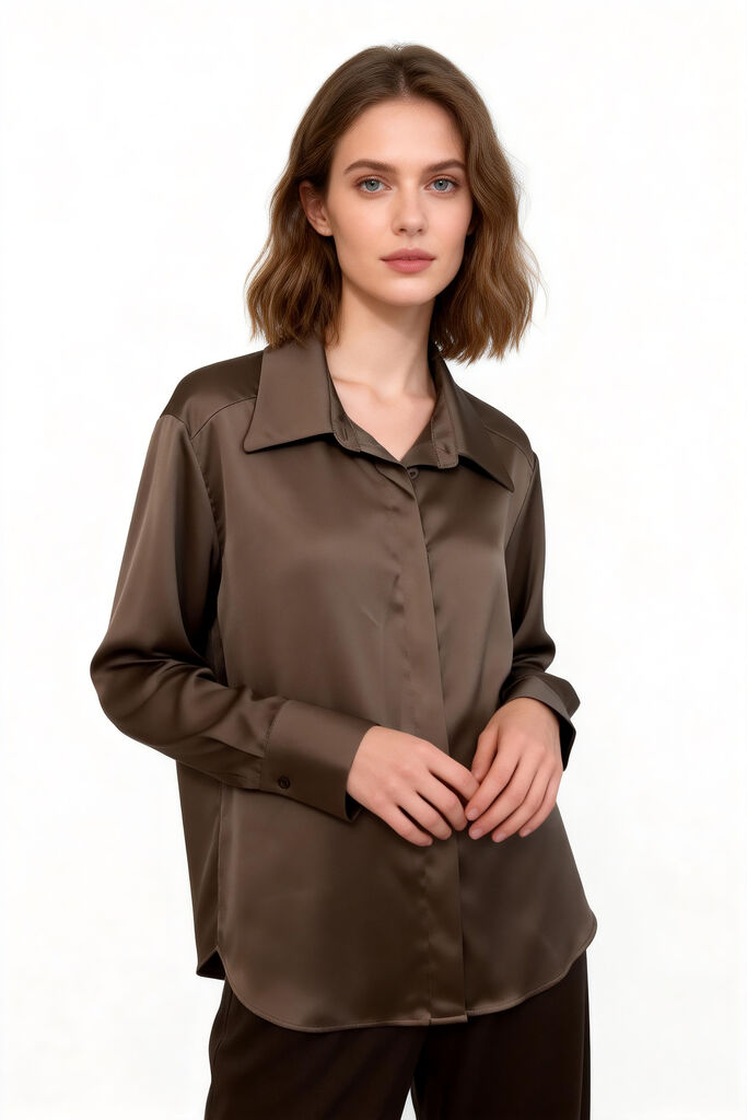 Effortlessly elevate your wardrobe with this luxurious chocolate satin shirt. Its relaxed fit and glossy finish make it perfect for work or casual outings, offering both comfort and elegance.