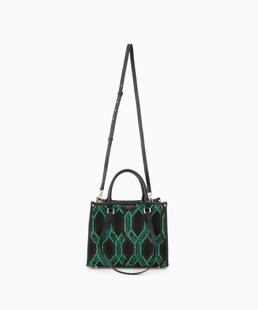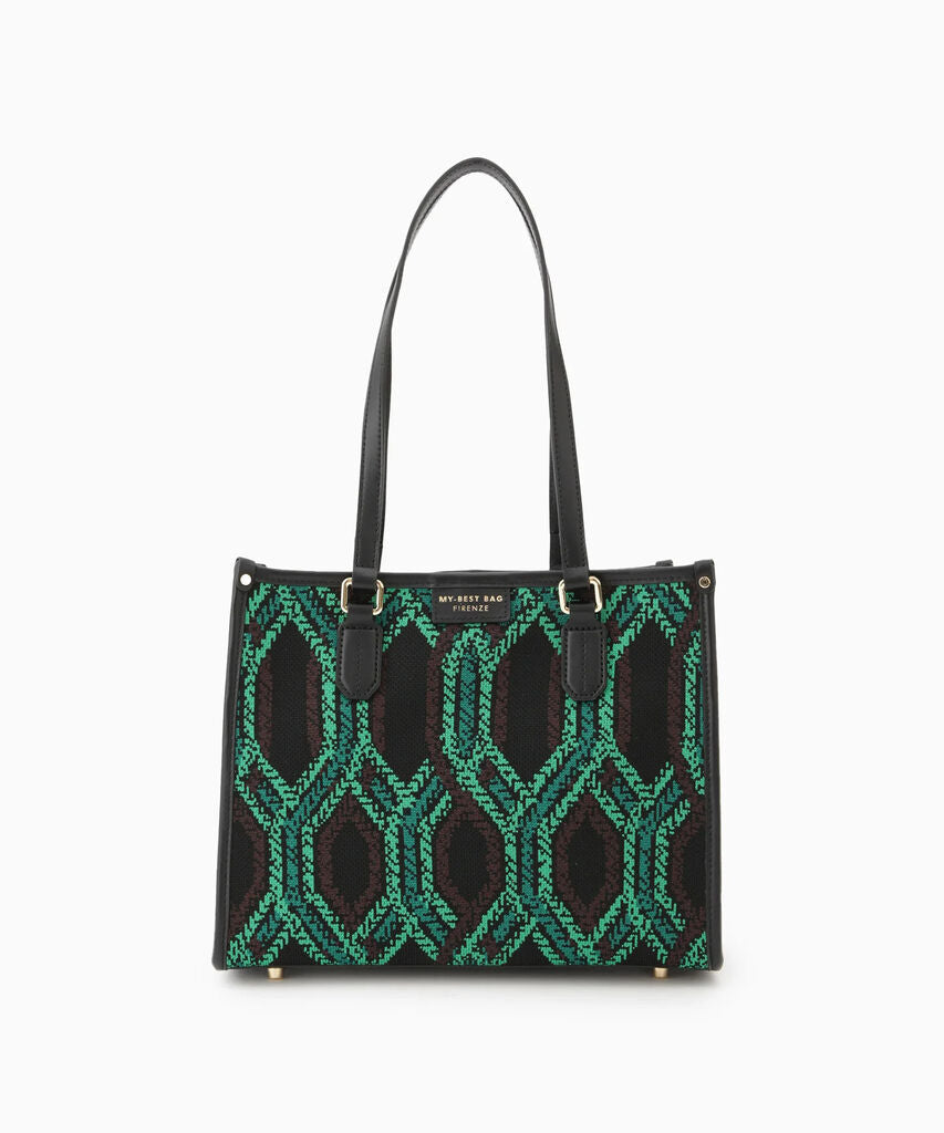 Elevate your ensemble with this uniquely patterned tote, featuring a striking geometric design and roomy interior for your essentials.