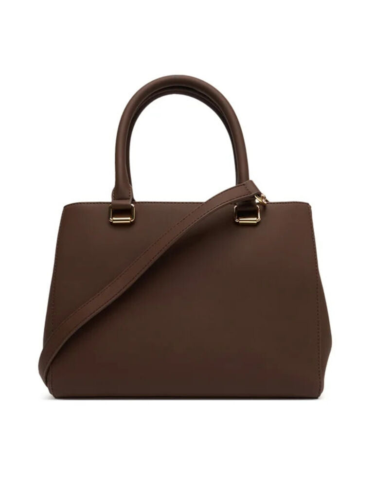 Experience elegant versatility with this brown tote bag, featuring bold logo embossing. Its structured shape and dual handles provide both style and function for any occasion.
