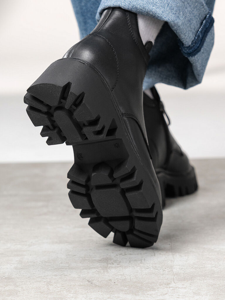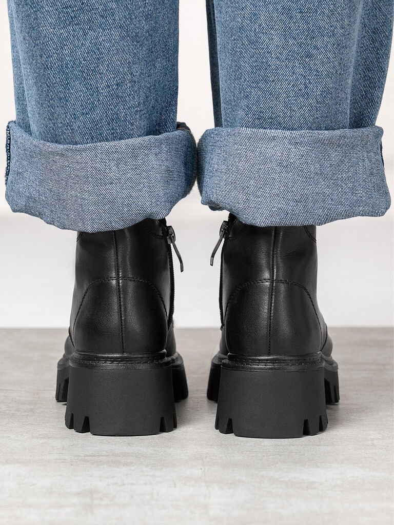 Experience unmatched grip and style with these sleek black leather ankle boots. The chunky sole provides a distinct edge and ensures all-day comfort. Perfect for navigating urban landscapes effortlessly.