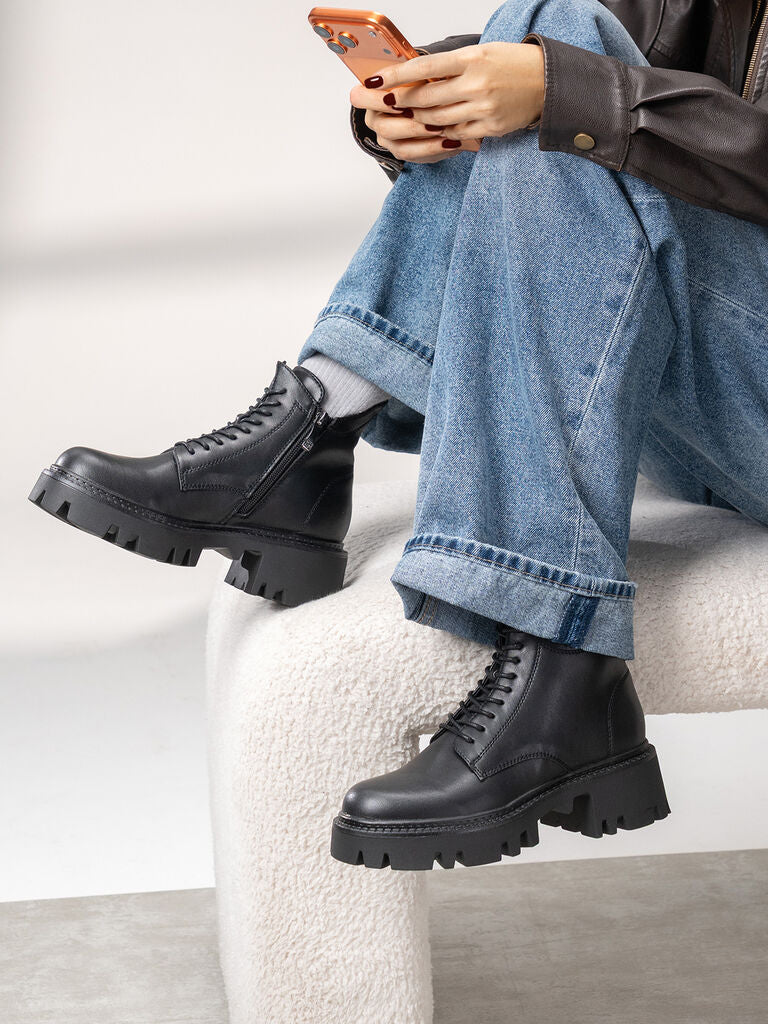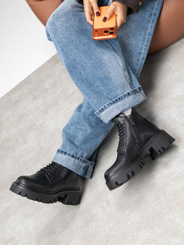Black Leather Ankle Boots with Chunky Sole