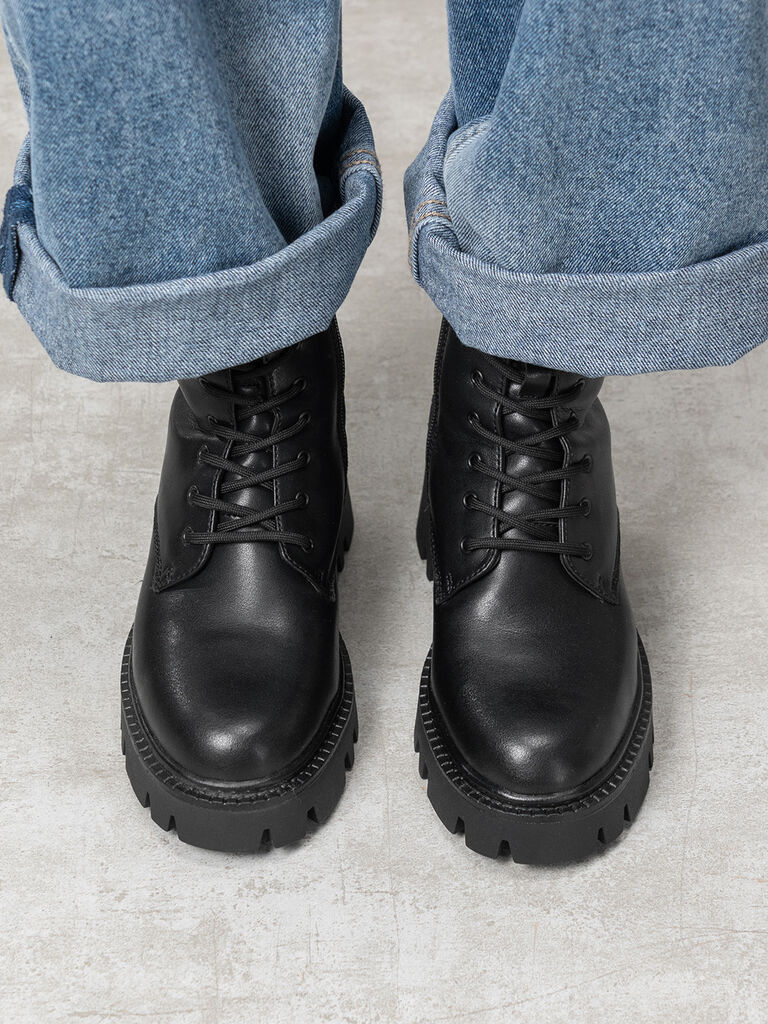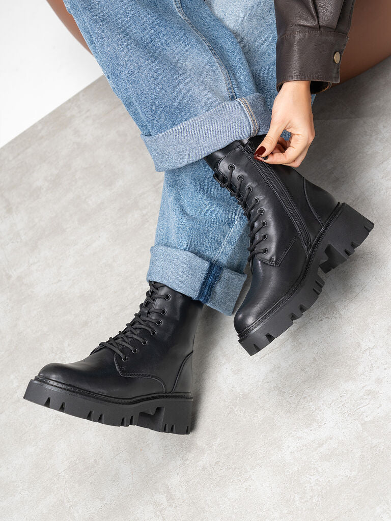 Experience unstoppable style with these black combat boots, designed for urban adventures. Their chunky sole offers both height and grip, perfect for city strolls.