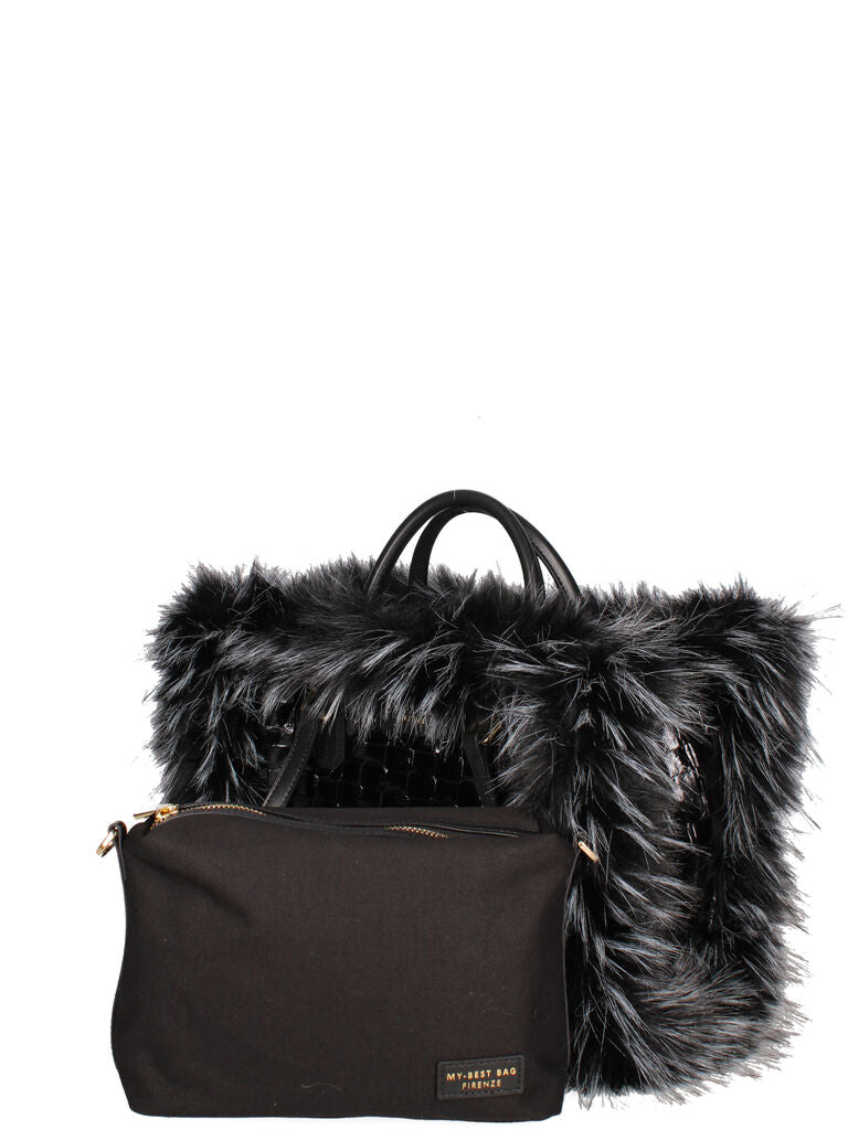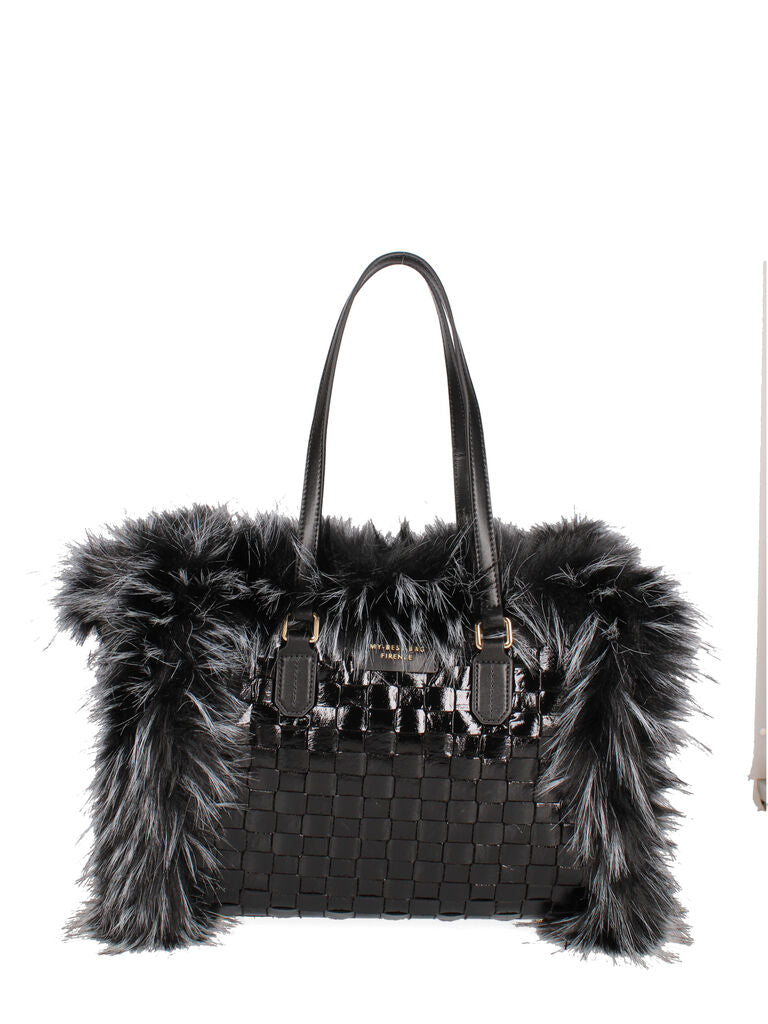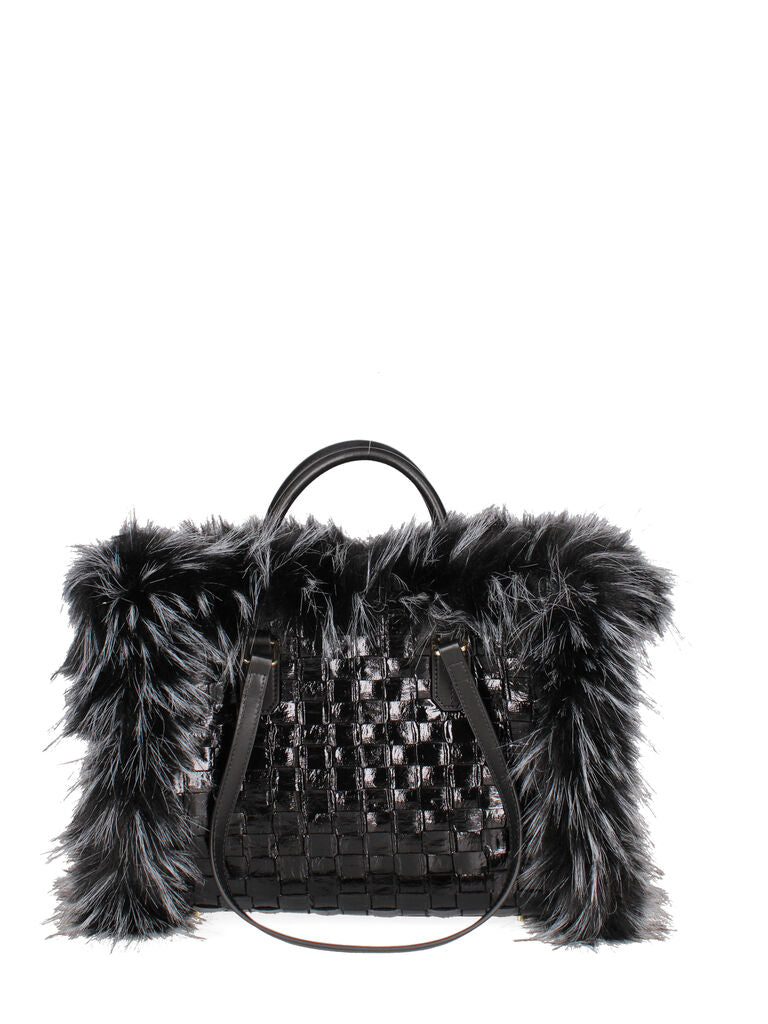 Black Faux Fur Trimmed Woven Tote Bag