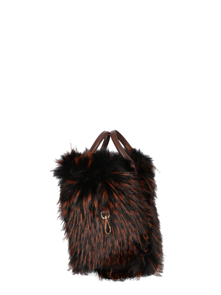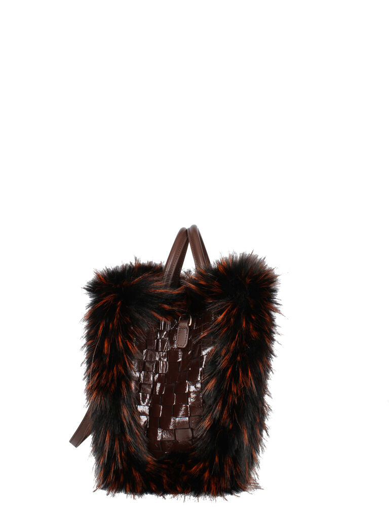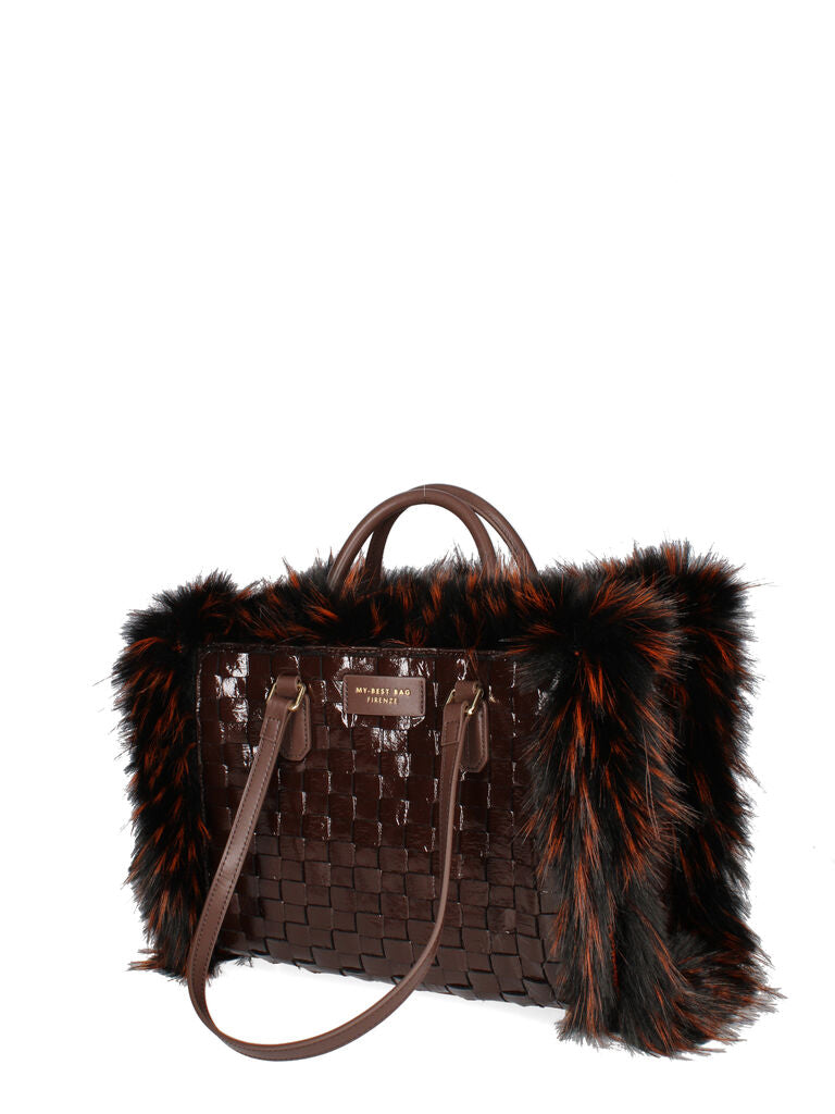 Brown Woven Tote Bag with Faux Fur Trim