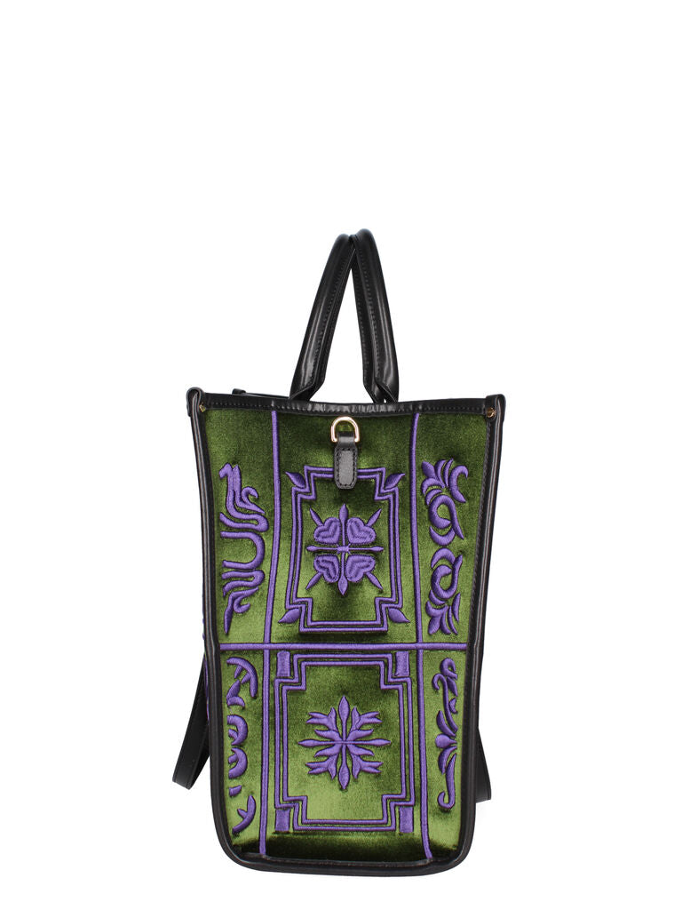 Green and Purple Embroidered Tote Bag with Panel Design