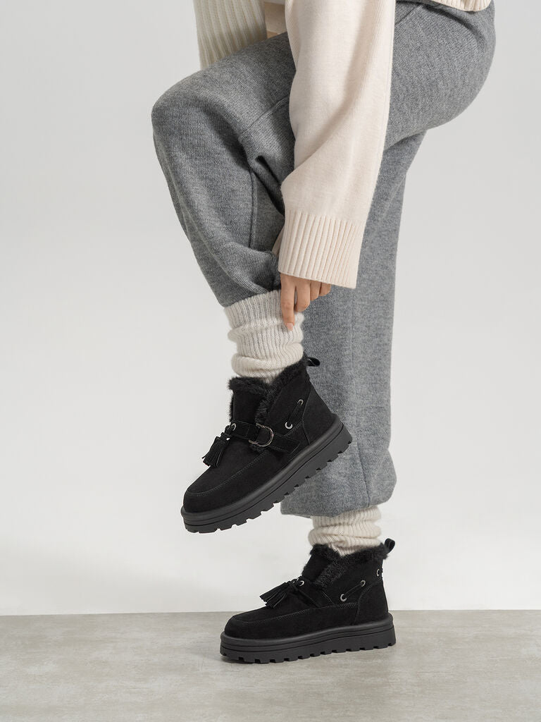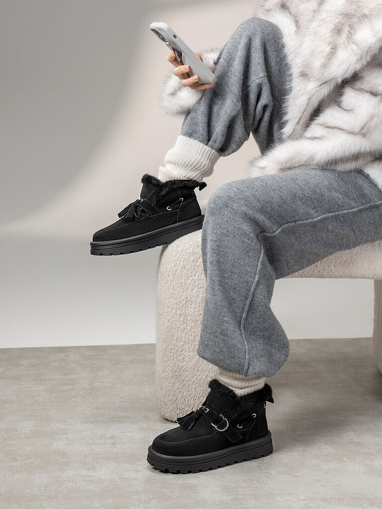 Embrace cozy elegance with these black suede ankle boots, featuring a plush faux fur trim. Perfect for crisp morning strolls or chic city evenings.