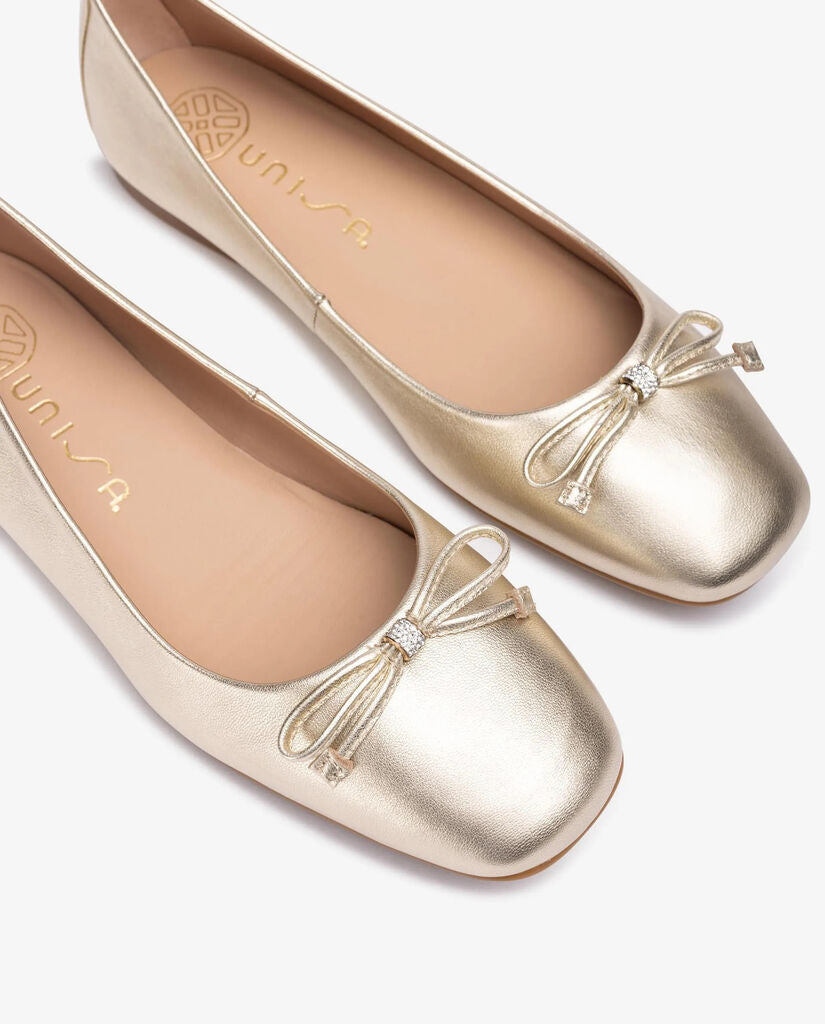 Experience elegance with these sleek gold satin ballet flats, enhanced with a subtle bow detail. Perfect for adding a touch of sophistication to any outfit.