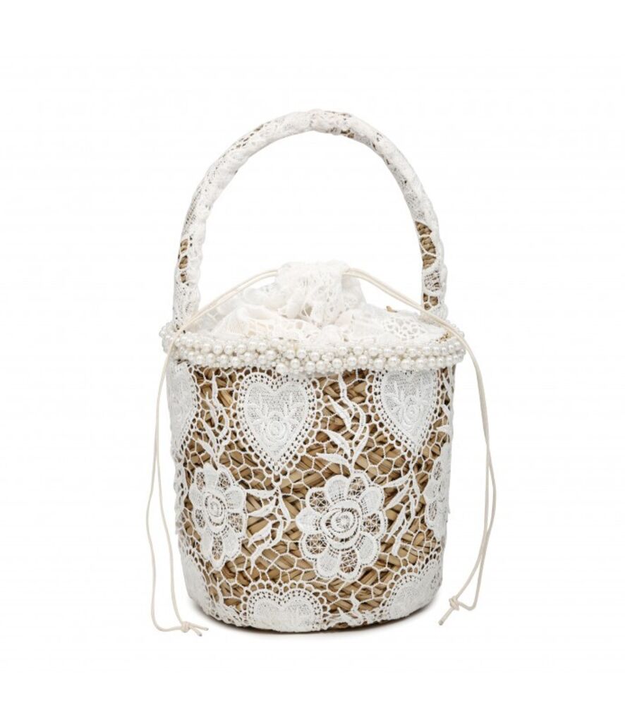Imagine a day out with this elegant lace bucket bag that beautifully complements any outfit. Delicate lace overlay and pearl accents create a timeless charm. Perfect for adding a touch of sophistication to your day.