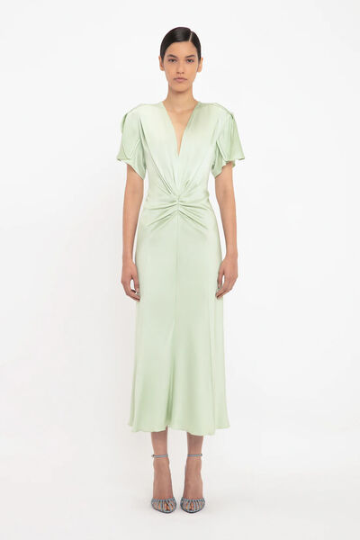 Embrace the gentle sophistication of this mint satin dress, perfectly tailored for elegance and ease. Featuring a flattering draped design, it effortlessly combines style with comfort, making it a graceful choice for any special occasion.