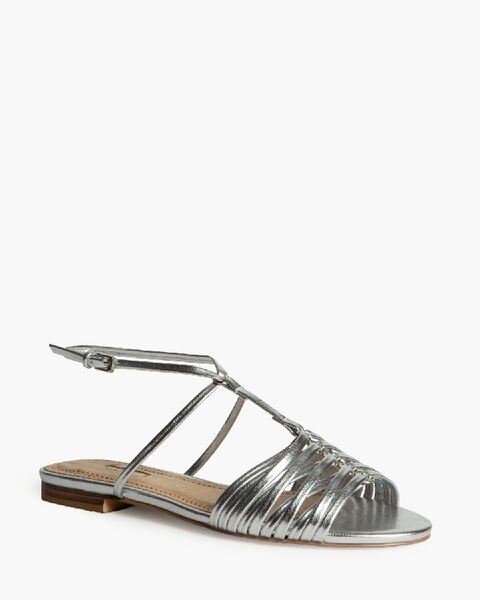 Slide into sophistication with these silver metallic sandals. Feel the comfortable flat sole and secure fit with the elegant ankle strap. Perfect for a day in the sun or a night out.