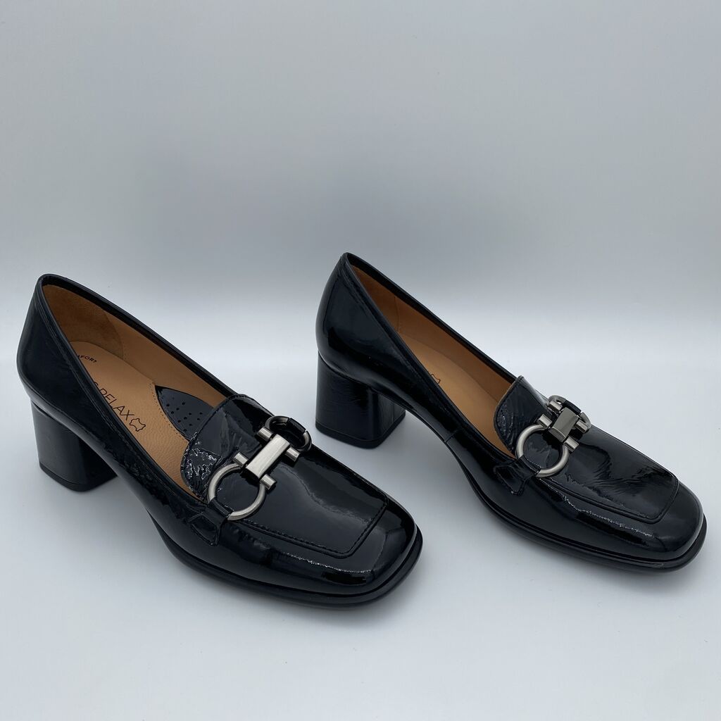 Elevate your style with these glossy black patent loafers. The chunky heel offers stability, while the decorative buckle adds a touch of elegance. Ideal for a polished, professional look.