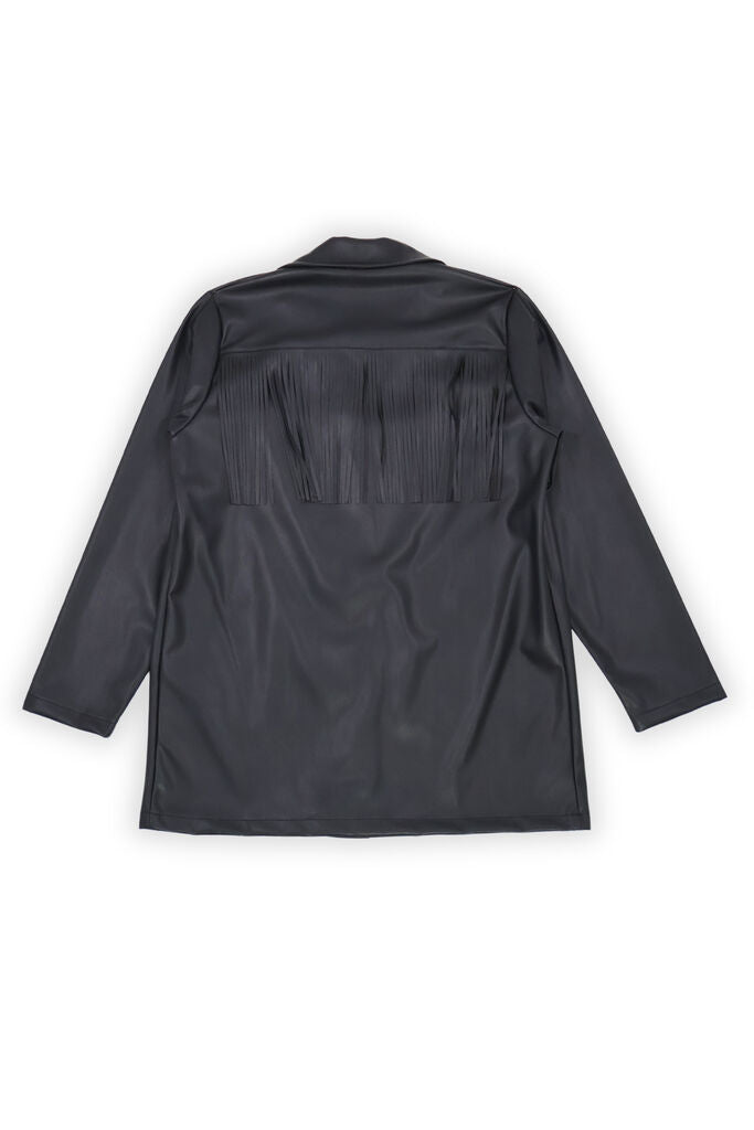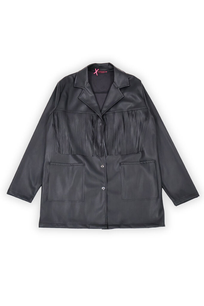 Elevate your outerwear with this sleek jacket. Crafted in black faux leather, the fringe detailing adds a unique twist. Perfect for layering, it offers both style and warmth.