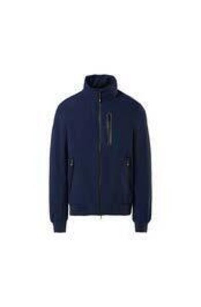 Embrace the crisp air with this navy jacket featuring a high collar and sleek zippered design. Perfect for layering, it transitions seamlessly from day to evening.