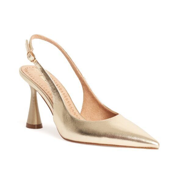 Experience elegance with these gold metallic slingback pumps. The pointed toe and sleek heel exude sophistication, perfect for a stylish evening out.