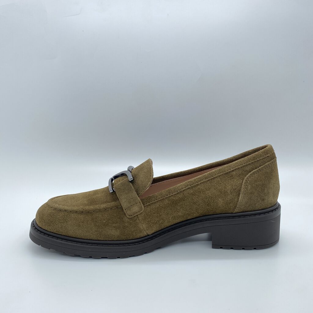 Experience the timeless elegance of these olive suede loafers, crafted for comfort and style. A subtle buckle detail adds a touch of sophistication. Perfect for any smart-casual occasion.