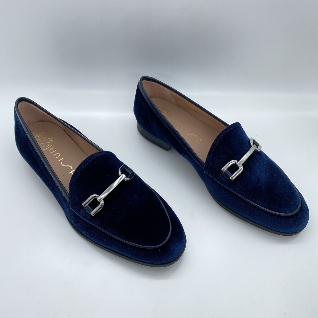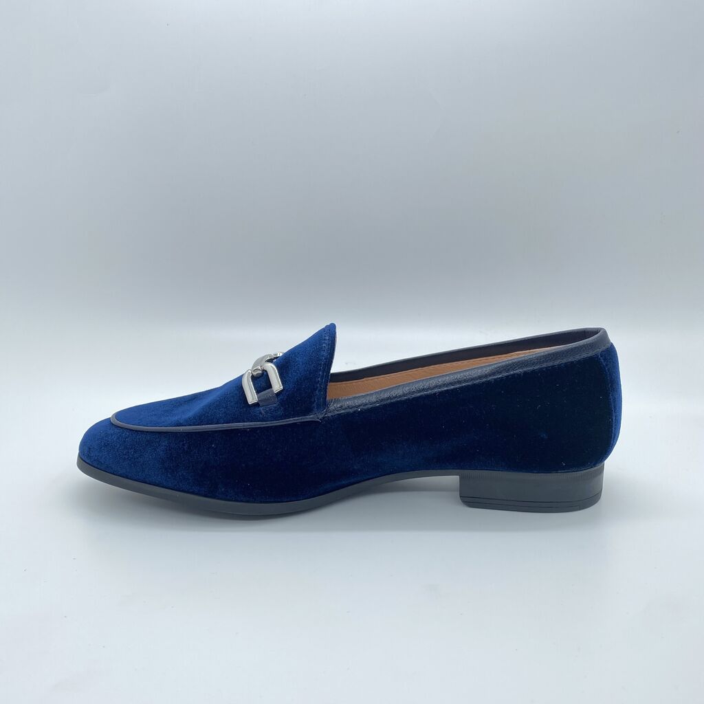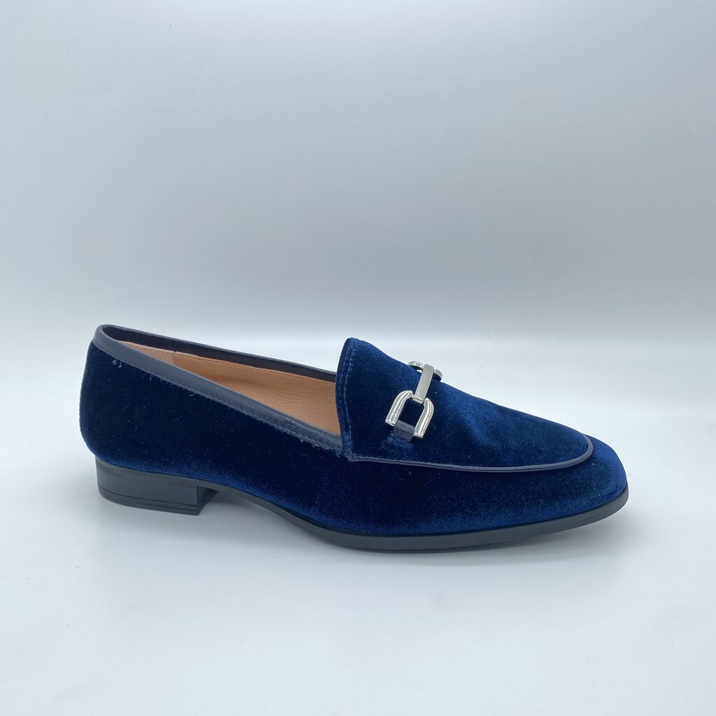 Embrace elegance with these navy velvet loafers, featuring a striking silver accent. Experience the luxurious texture and timeless appeal.