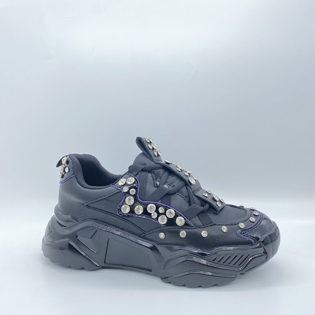 Enhance your urban style with these striking black sneakers. The rhinestone embellishments add a unique flair, perfect for standing out. Experience comfort with a sturdy sole, ideal for strolls or casual outings.