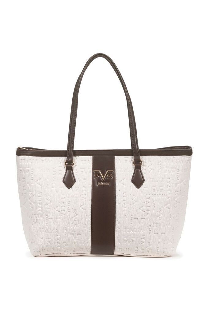 Experience effortless elegance with this embossed tote bag. Its spacious interior and sturdy handles make it perfect for everyday use, while the contrasting brown trim adds a chic touch.