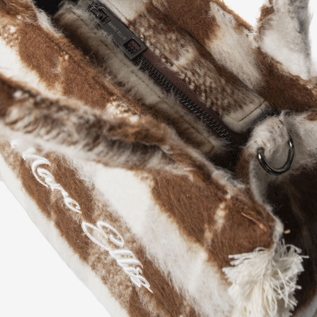 Carry your essentials in this chic tote, featuring a cozy plaid pattern and stylish logo detail. Perfect for adding a touch of warmth to your outfits.