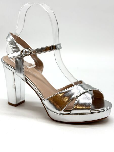 Elevate your style with these shimmering silver platform sandals. The secure ankle strap combines with a glossy finish for a touch of glamour, perfect for evening events. Imagine the confidence with each step in these sleek heels.