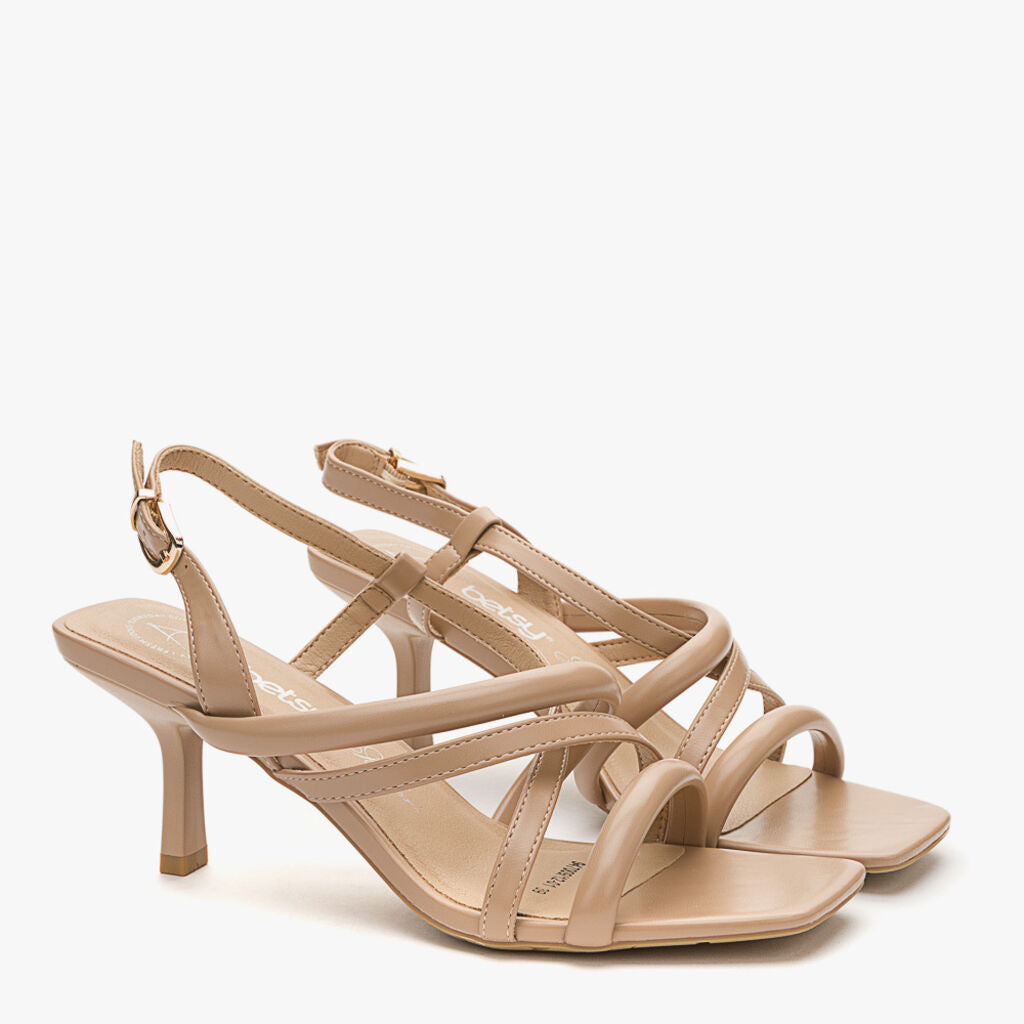These beige strappy sandals offer a polished look with a comfortable kitten heel. The glossy straps provide a sophisticated touch, perfect for any elegant occasion.