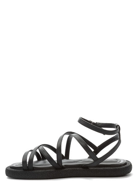 Embrace effortless style with these black strappy sandals featuring a cushioned sole for all-day comfort.