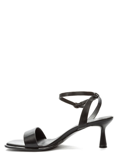 Experience the sleek elegance of these black sandals, featuring a chic ankle strap and refined heel for graceful comfort. Perfect for making a subtle statement.