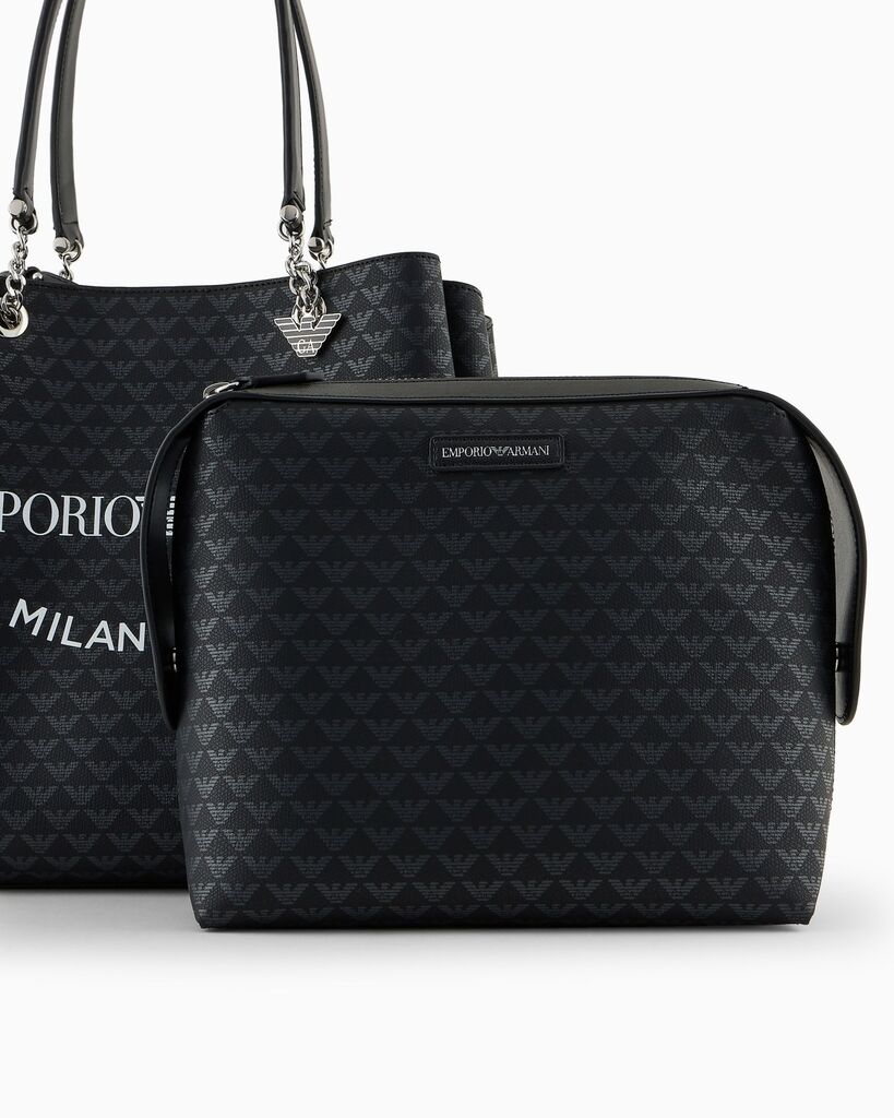 Elevate your look with this chic black tote, adorned with a distinctive logo pattern. Its structured shape and chain handles provide a sophisticated touch, perfect for both casual outings and polished occasions.
