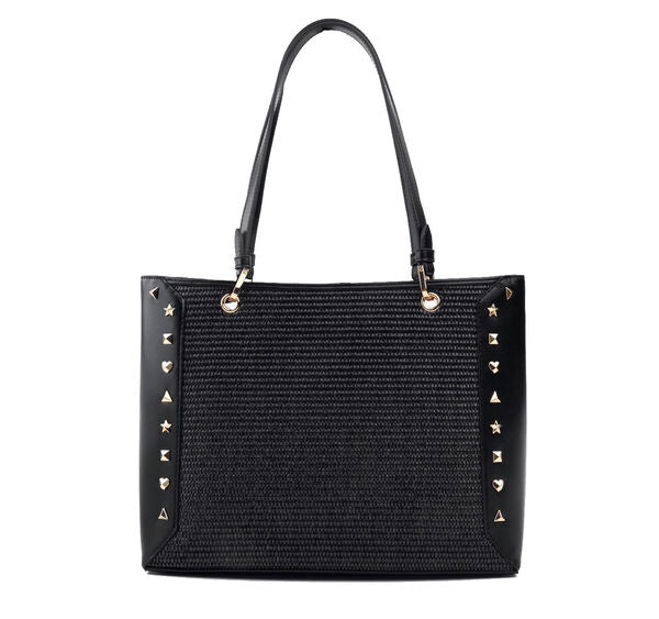 Elevate your daily style with this distinctive tote's bold texture and studded charm. Spacious and stylish, it's perfect for carrying essentials effortlessly.