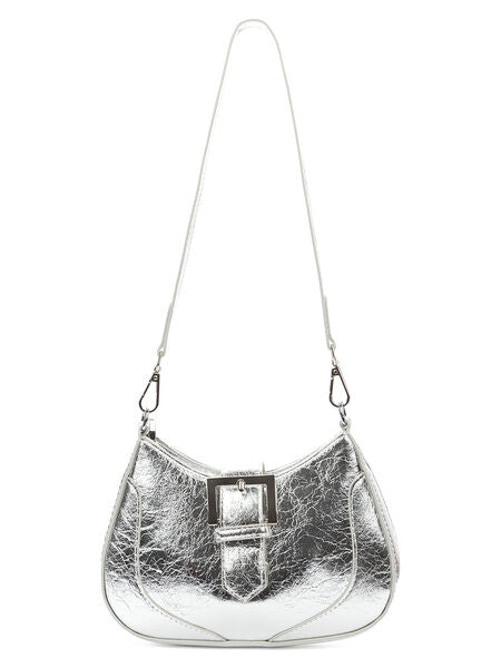 Step into elegance with this silver metallic saddle bag. Featuring a chic buckle closure, it's perfect for adding a touch of glam to any outfit. Its structured shape enhances your silhouette beautifully, making it ideal for a night out or special