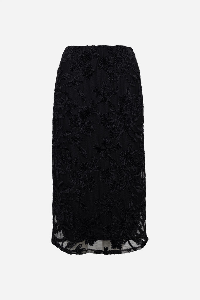 Immerse yourself in elegance with this intricately embroidered black lace skirt. The sheer hem adds a delicate touch, ideal for sophisticated gatherings.