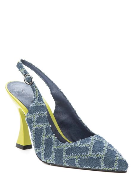 Embrace a blend of bold design and comfort with these slingback heels, featuring a striking yellow heel and a textured blue fabric. Ideal for adding a touch of flair to your evening ensemble.