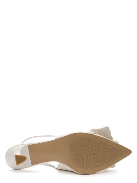 Embrace elegance with these white slingback heels, adorned with a delicate floral accent. Perfect for weddings and formal occasions, they offer both sophistication and comfort. Let them complement your graceful presence.
