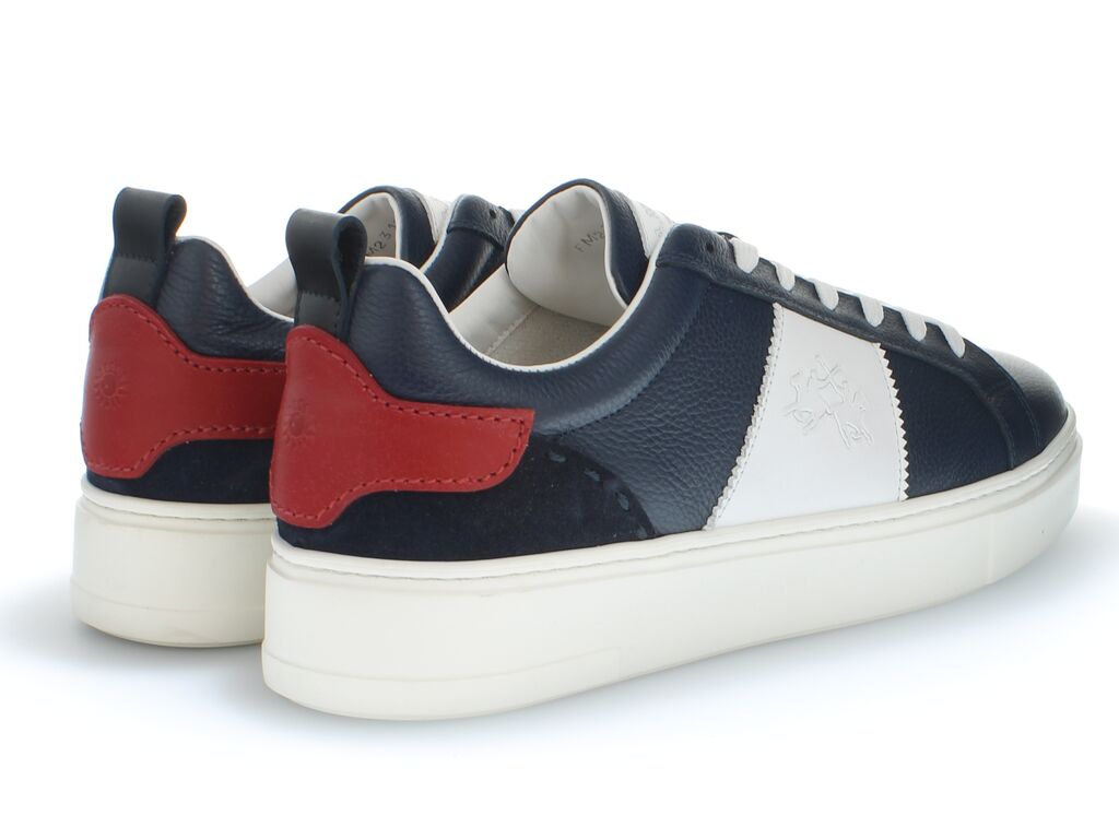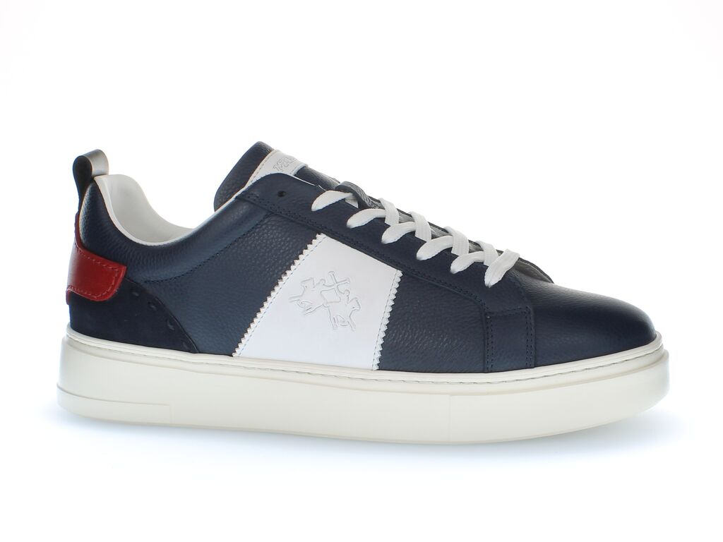 Experience a blend of comfort and style with these navy leather sneakers. The embossed logo adds a touch of sophistication to your casual look. Perfect for a versatile wardrobe.