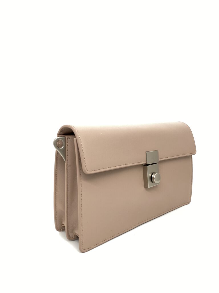 Embrace elegance with this sleek tan clutch, featuring a chic silver clasp for a modern look. Perfectly sized for essentials, it adds a refined touch to any ensemble.